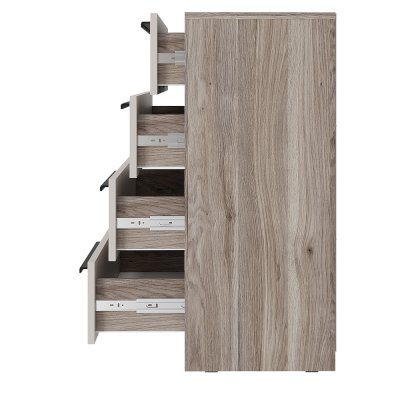 Комод "Урбан" – это универсальная модель, которая подойдет для спальни, домашнего офиса или гостиной. Четыре вместительных ящика станут идеальным дополнительным пространством для хранения белья, одежды, документов и мелочей. Эргономичные ручки из прочного пластика обеспечат удобное ежедневное использование. Устойчивые подпятники защитят напольное покрытие и позволят без труда проводить влажную уборку.